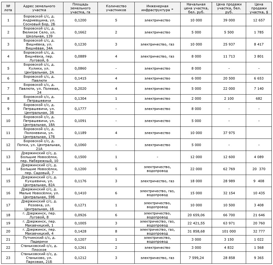 Участки на аукцион выставляли Боровской сельсовет (12), Дзержинский (5), г. Дзержинск (3), Путчинский (1) и Станьковский (2).